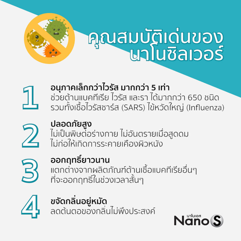 Nano S เป็นสารNano Silver ที่มีประสิทธิภาพในการกำจัดเชื้อได้ดีกว่าทั่วไป สามารถกำจัดเชื้อไวรัส แบคทีเรียและรา ได้มากกว่า 650 ชนิด รวมทั้งเชื้อไวรัสซาร์ส (SARS, atypical pneumonia virus) ไข้หวัดใหญ่ เอนเทอโรไวรัส และอื่นๆ โดยไม่เป็นพิษต่อร่างกาย จึงเป็นสารที่ปลอดภัย ไม่ก่อให้เกิดอาการแพ้ ระคายเคือง หรืออันตรายใดๆ เมื่อเทียบกับแอลกอฮอล์และยาฆ่าเชื้อทั่วไป และด้วยคุณสมบัติเด่นในการกำจัดเชื้อโรค และมีความปลอดภัยสูง Nano Silver จึงถูกนำมาใช้ในทางการแพทย์ และของใช้อุปโภคบริโภคหลายชนิดมานานแล้ว เช่น เคลือบท่อหายใจ เคลือบแผ่นปิดแผล เป็นส่วนผสมในครีมรักษาสิว เป็นส่วนผสมในผงซักฟอก เครื่องซักผ้า เครื่องกรองน้ำ เป็นต้น